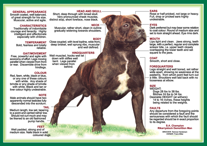 | Colour | Red, fawn, white, black or blue, or any one of these colours with white. Any shade of brindle or any shade of brindle with white. Black and tan or liver colour highly undesirable. |