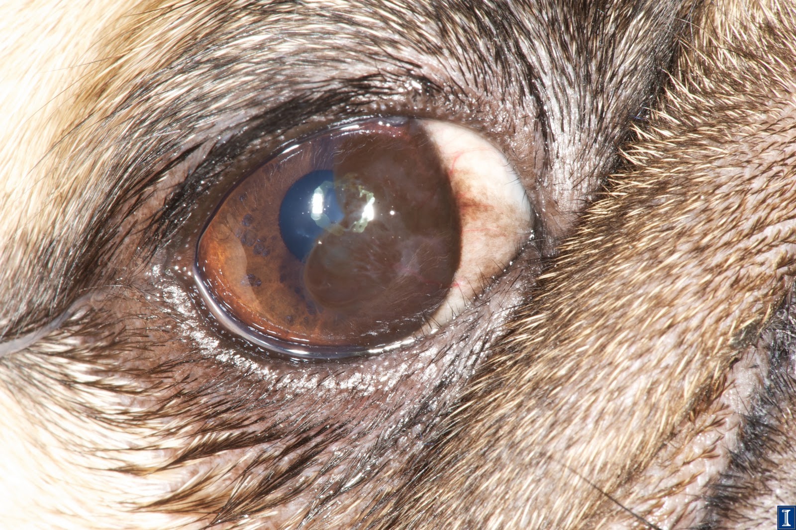 Entropion is a genetic condition in which a portion of the eyelid is inverted or folded inward. This can cause an eyelash or hair to irritate and scratch the surface of the eye, leading to corneal ulceration or perforation. It can also cause dark-colored scar tissue to build up over the wound (pigmentary keratitis). These factors may cause a decrease or loss of vision.