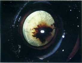 The presence of mild abnormalities are usually seen as small brown pigmented dots on the posterior lens capsule. Previously the literature indicated that this was always observed as a bilateral phenomenon but recently it has been stated that affected dogs may show unilateral involvement, although this is less common.